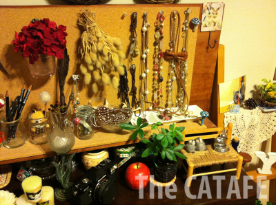 ナチュキチかセリアか忘れましたが、ワイヤーかごにドイリー、BODYSHOPのパンダ石鹸、K×Kの福袋に入ってたサボテンキャンドル、ドライフラワーを適当に入れたものを前に置いて、ここをiPod置き場にしました。