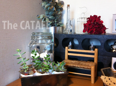 床にそのまま置いていたティーキャンドル入りの瓶(キャンドゥ)も多肉さんの後ろに落ち着きました。