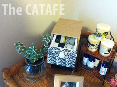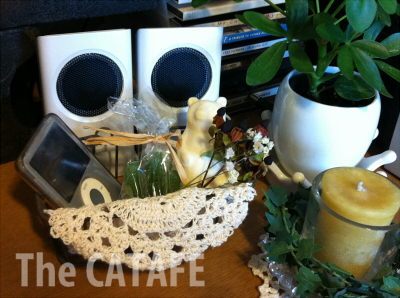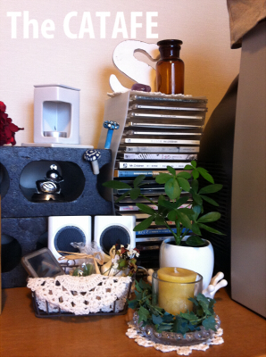 ナチュキチかセリアか忘れましたが、ワイヤーかごにドイリー、BODYSHOPのパンダ石鹸、K×Kの福袋に入ってたサボテンキャンドル、ドライフラワーを適当に入れたものを前に置いて、ここをiPod置き場にしました。