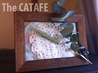 中に英字新聞とドイリーを挟んで、ユーカリと麦のドライを目玉クリップで束ねてそれを黒マステでフレームにぺたっとしただけ!